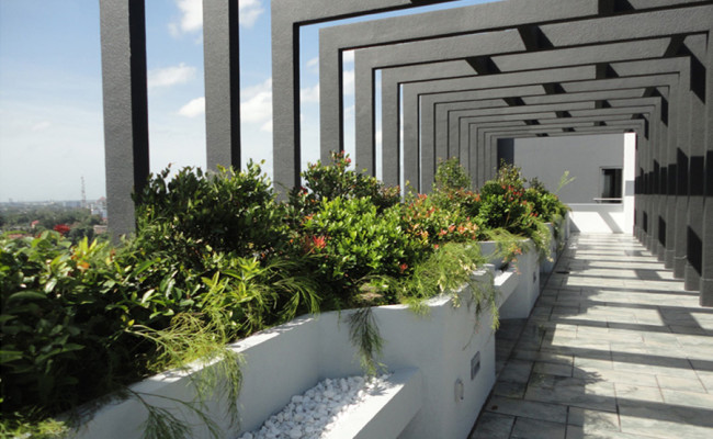 An extensive glass curtain wall and cable support structure was installed on the west wing of the building. Installation of the cable supporting structure required precision handling during the placing of anchors & inserts and the fixing of I-beams, whilst special measuring equipment was used to test whether the cable support structure had achieved the required tension strength. The outdoor recreational area of the 11th floor contains a cell-type Pergola structure, which can be sheltered for special occasions.